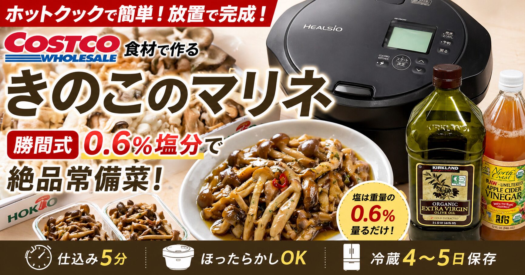 ホットクック「きのこのマリネ」レシピ|コストコ食材×勝間式0.6%塩分で絶品常備菜