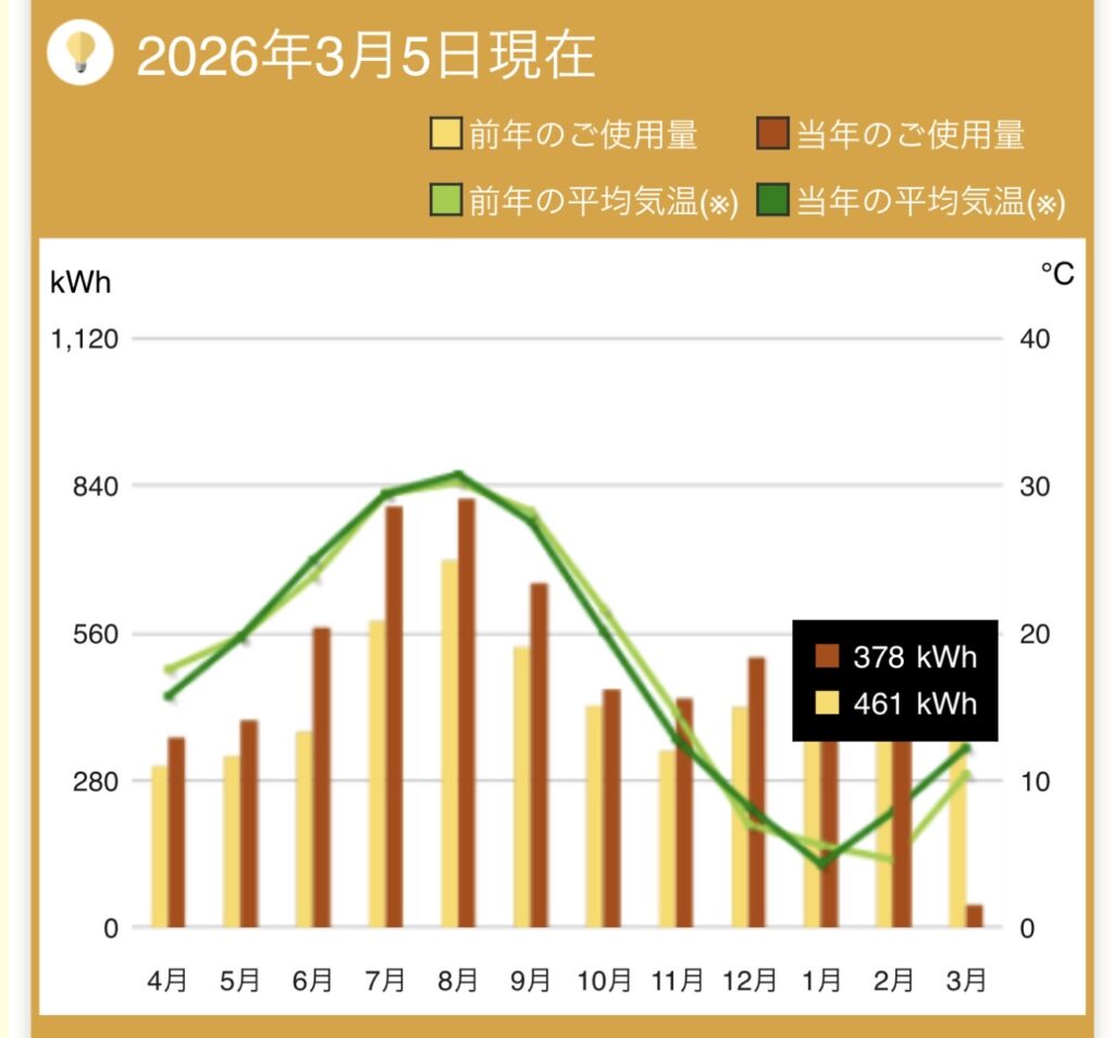 なんと、去年と比べてマイナス83kWh(約18%ダウン)を達成しました!
