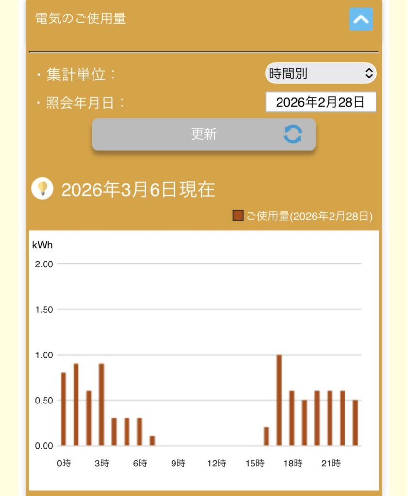 晴れた日(2026年2月28日)の時間別使用量グラフを見てください。
